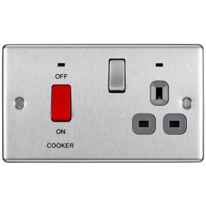 This 45A cooker control unit includes a 13A socket for an additional appliance outlet and has flush LED indicators above the socket and switch. Designed with captive screws for ease of installation this switch has a raised metal faceplate with brushed steel finish.