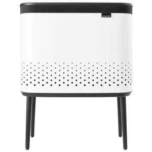 The big 60L Brabantia Bo Laundry Bin incorporates a beautiful design with practicality. It fits flat against the wall and the adjustable long non-skid legs make it very stable. Thanks to the clever quick-drop opening you don’t even have to open the lid when you put items in the bin. The white finish with black plastic lid can suit most decors and due to its design the laundry is hidden from view.