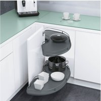 This corner storage solution uses two independantly operating shelves to allow easy access to previously hard to reach items. Maximised storage space & optimal access Up to 25 kg per shelf Power Assisted Movement in pull-out direction resulting in soft open and close EasyFit: tool-free assembly of shelf elements on the support arms